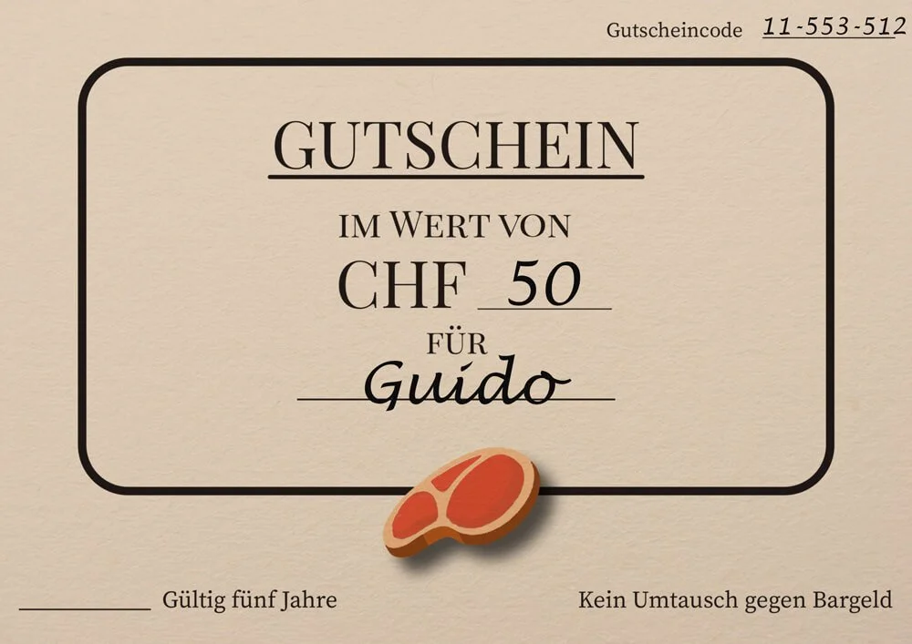 Unser Mittagsmenu, Burger oder Bratwurst als Geschenk? Mit unseren Gutschein machen Sie Fleischliebhabern eine Freude. Ab CHF 20 erhältlich im Laden oder telefonisch unter +41 44 304 66 09.